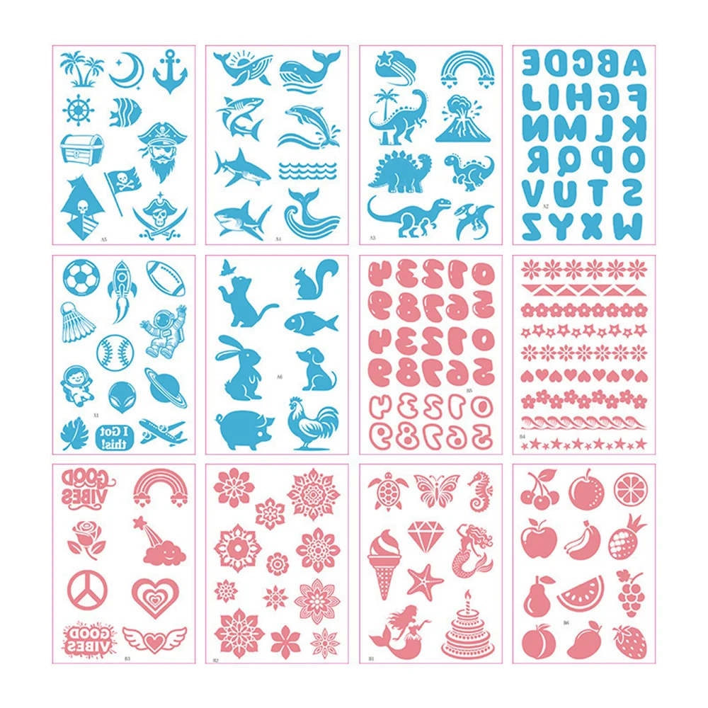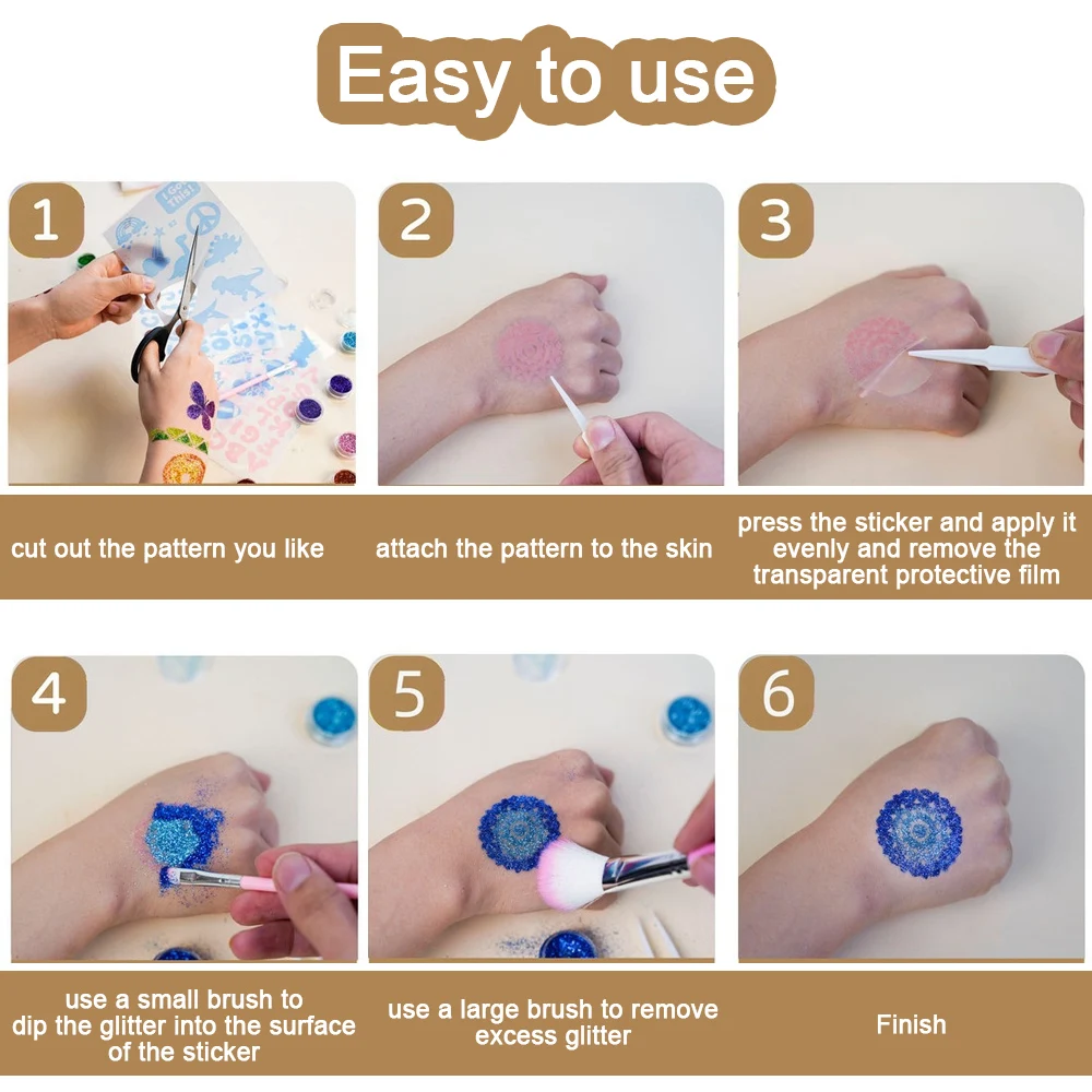 We have selected the most popular tattoo designs, flowers, letters, animals, fairies, etc.. Our tattoo templates avoids the trouble of applying glue and is easier to use, just stick the tattoo template on the skin you want to tattoo and apply the glitter tattoos powder with brush. Finally, use a large brush to remove the excess glitter.