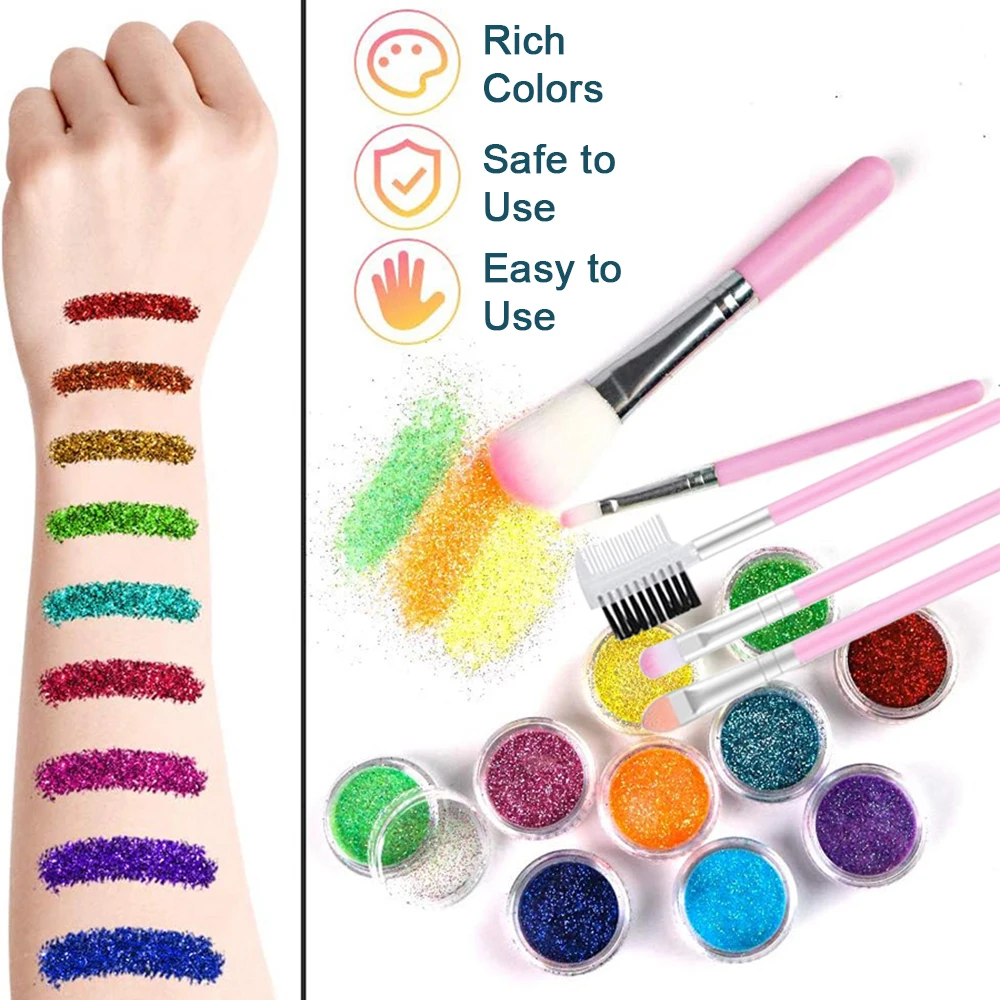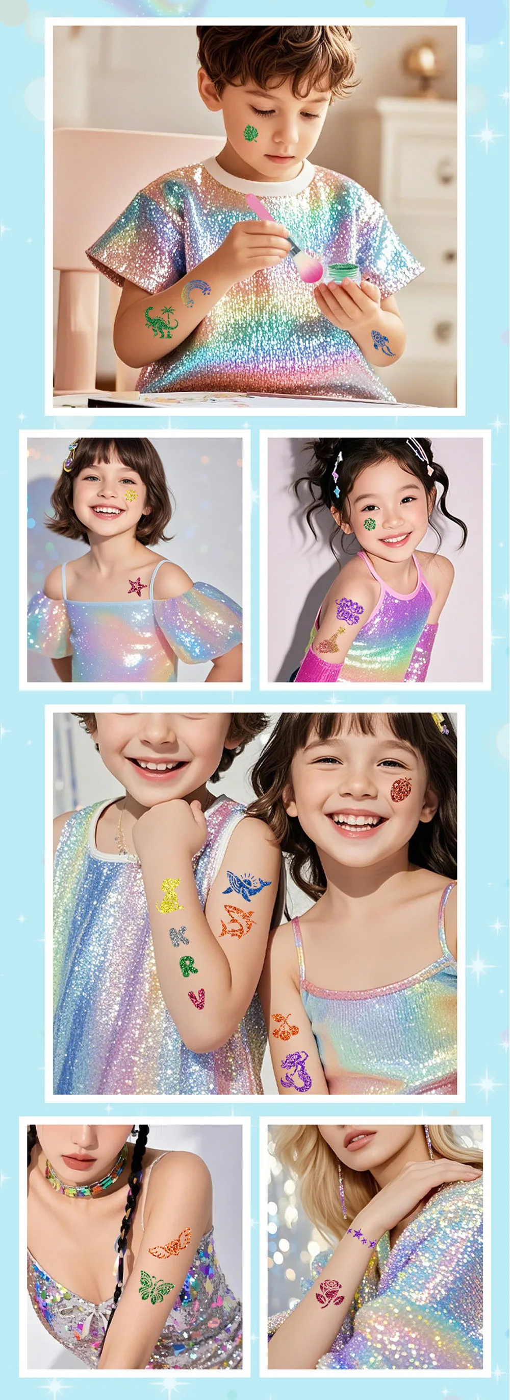 Our tattoo glitter powder are made from eco-friendly materials, which are safe for children's skin and can be used on any part of the body, arms , face, legs, etc. These children's temporary tattoo are waterproof, they can last up to 3 to 7 days without rubbing and are easily removed with a little soapy water.