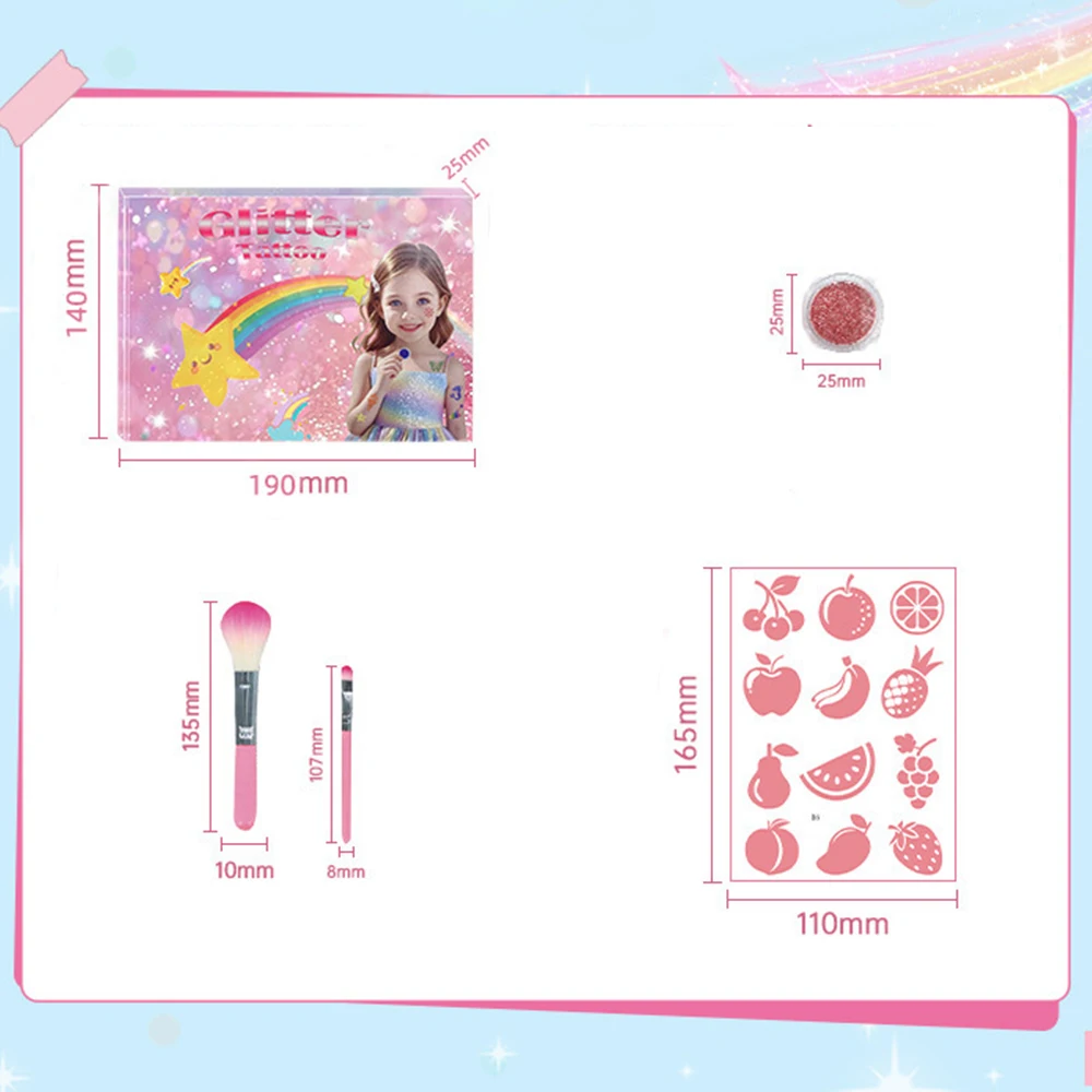 Glitter tattoo kit with super cute gift box design, contains 12 vibrant colors, 14 unique kids tattoos templates, 1 glues, 5 brushes and 2 face gems.