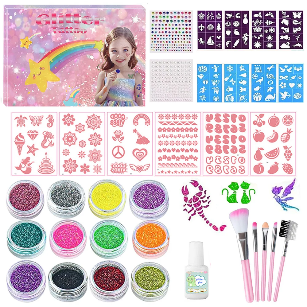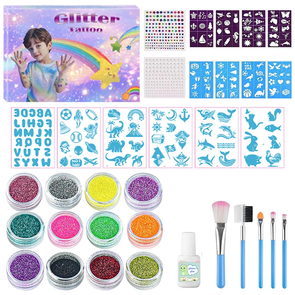 Temporary Glitter Tattoo with Stencils 12 Glitter Colors Adults Kids Arts Glitter Make Up Kit Gifts for Girls Boys Birthday