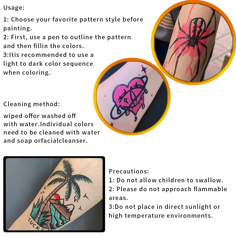 ●【Easy to Clean】: The multi-coloured temporary tattoo pens can be used on shoulders, arms, legs, face and backs. When it's time to remove your temporary tattoo, simply wash it off with soap and water for a reassuring body painting.